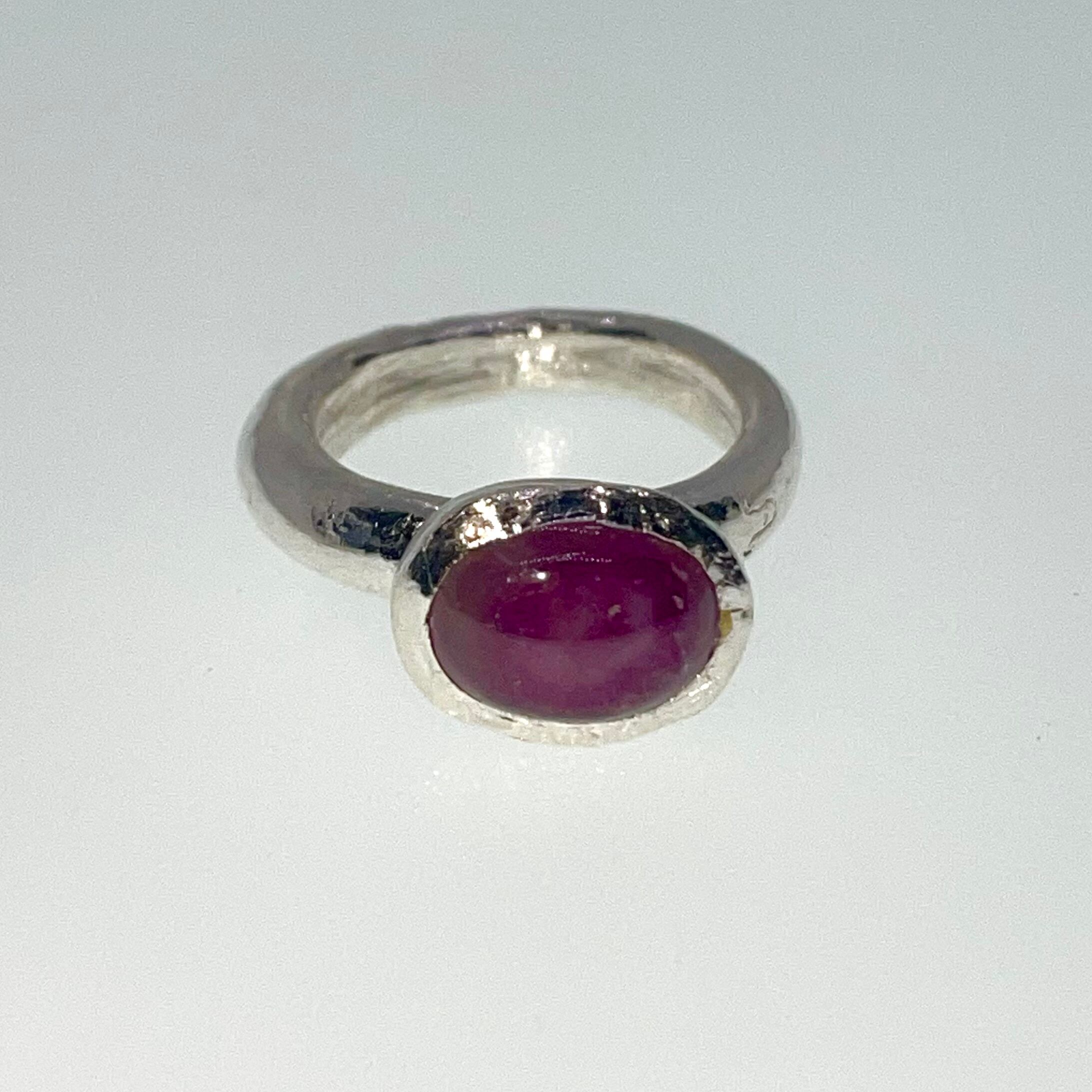 純度99.9%以上のリサイクル銀粘土に天然のルビーを埋め込んで焼き上げたシルバーリングです。