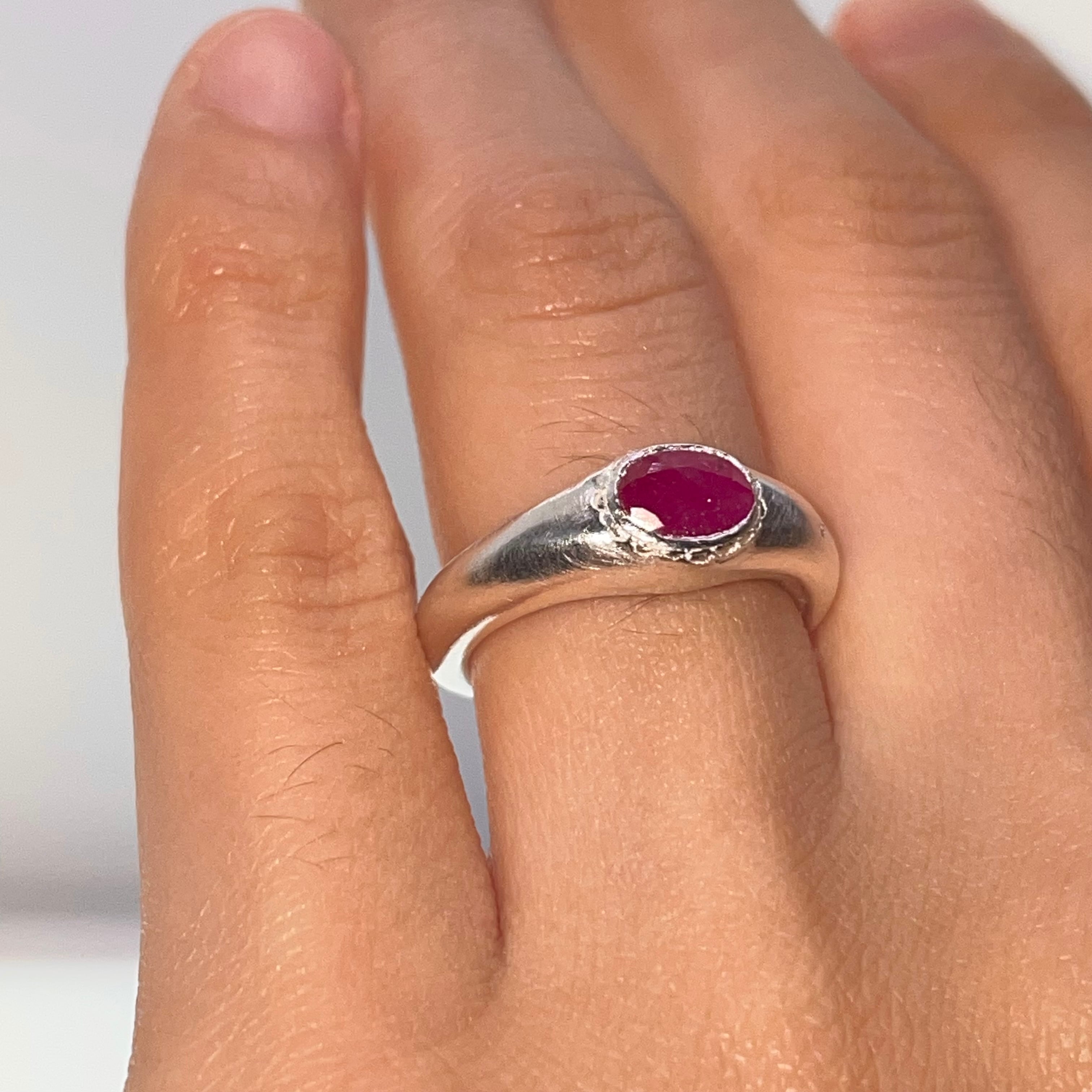 純度99.9%以上のリサイクル銀粘土に天然のルビーを埋め込んで焼き上げたシルバーリングです。