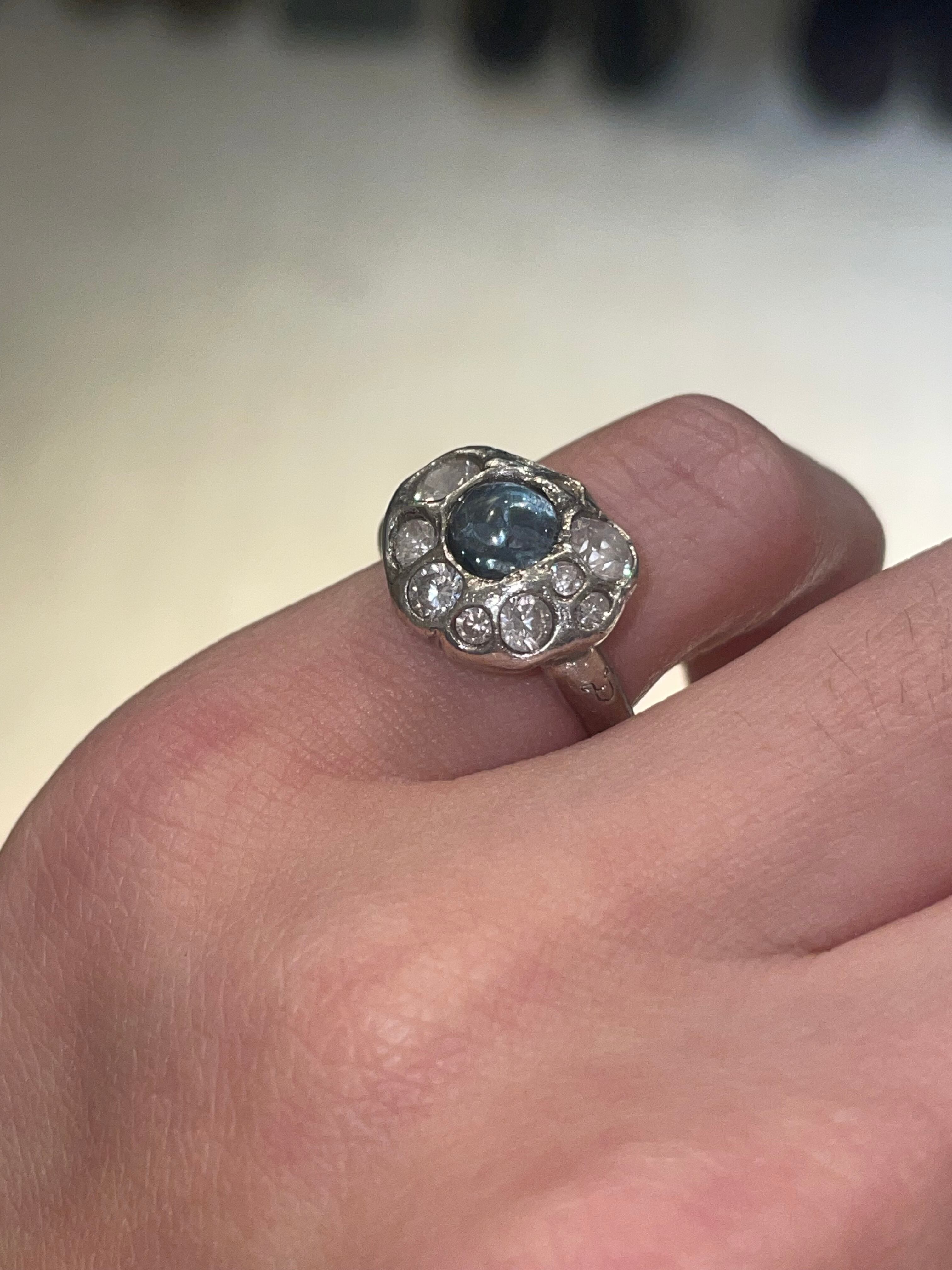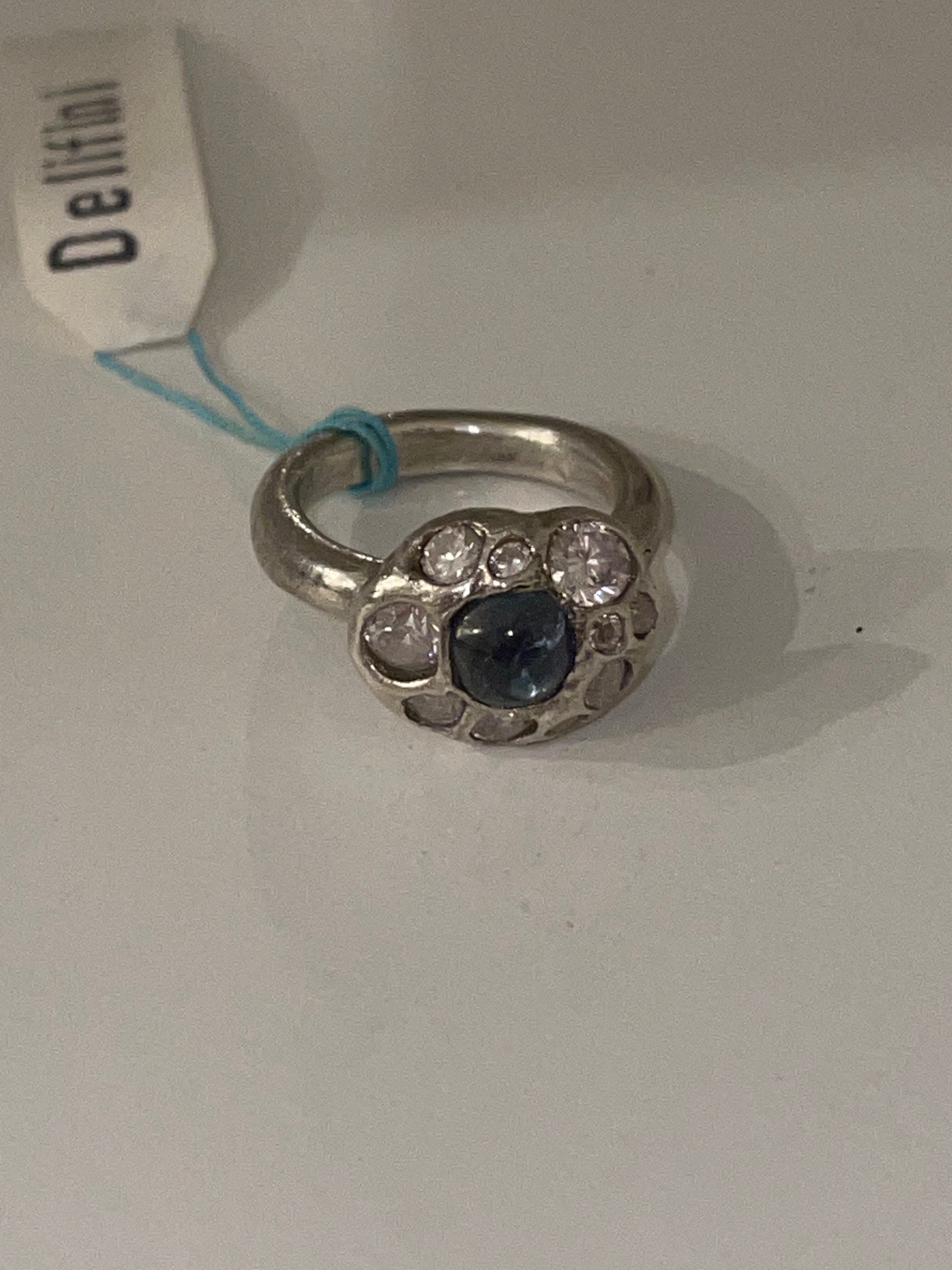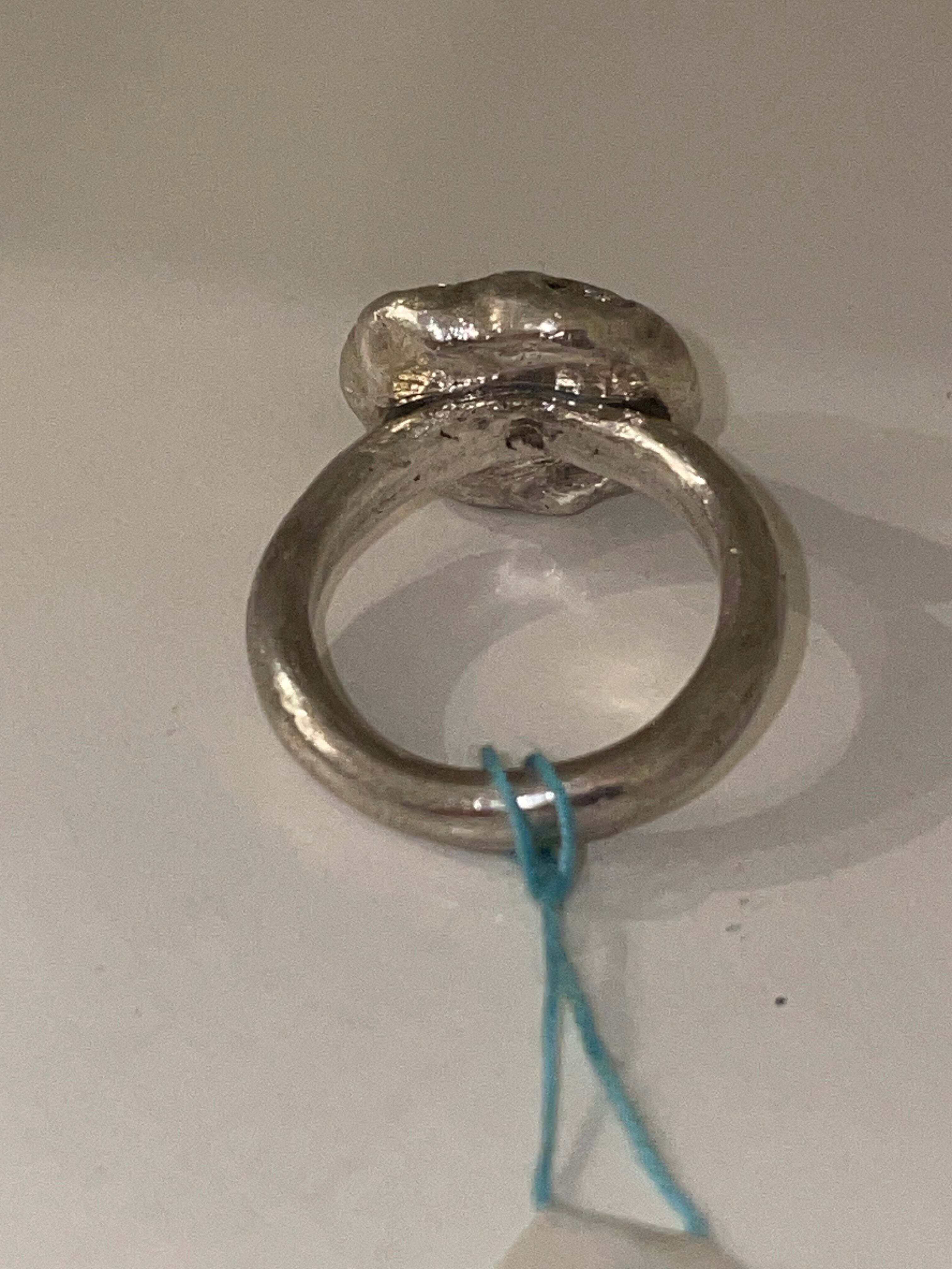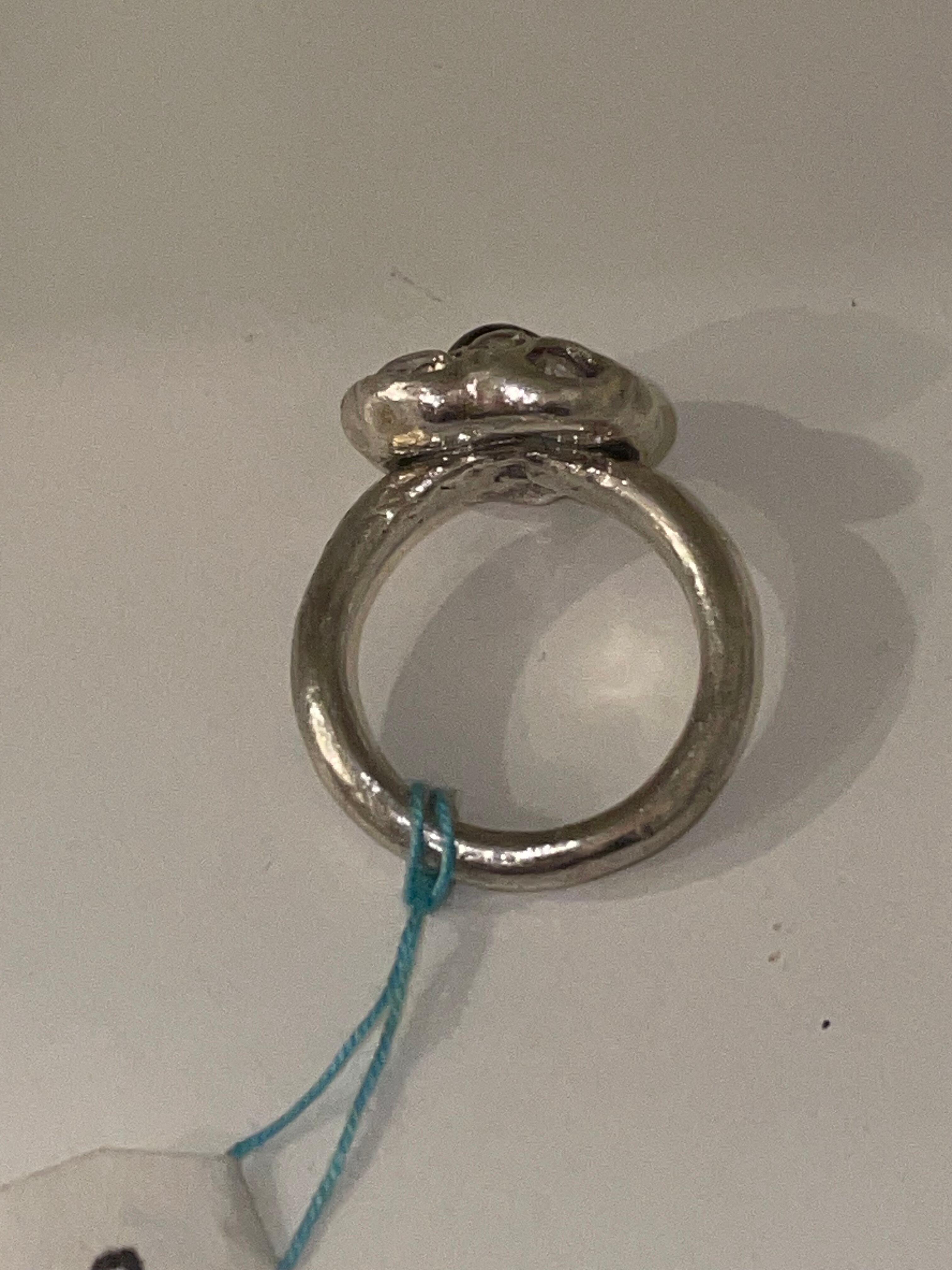 純度99.9%以上のリサイクル銀粘土に合成石埋め込んで焼き上げたシルバーリングです。