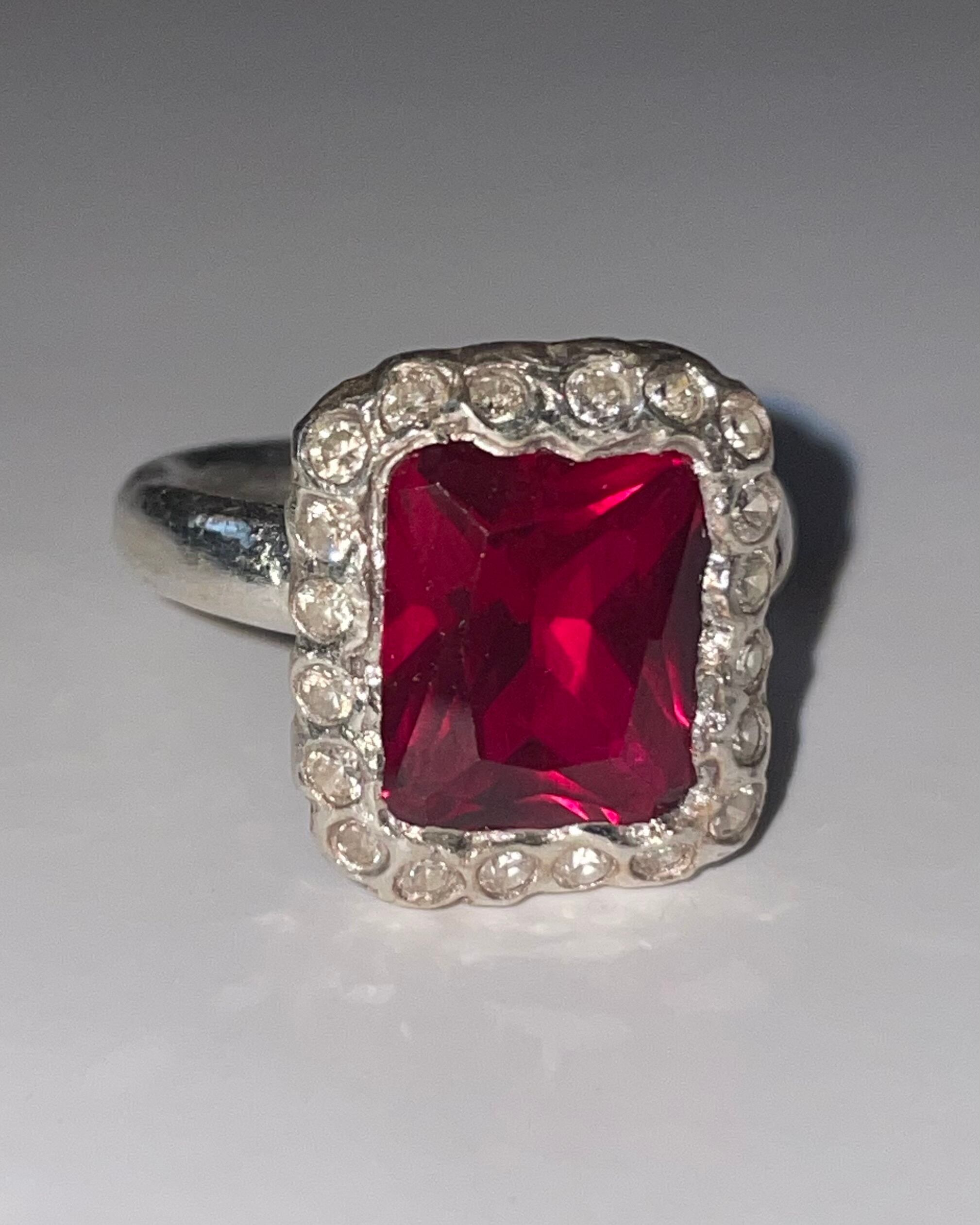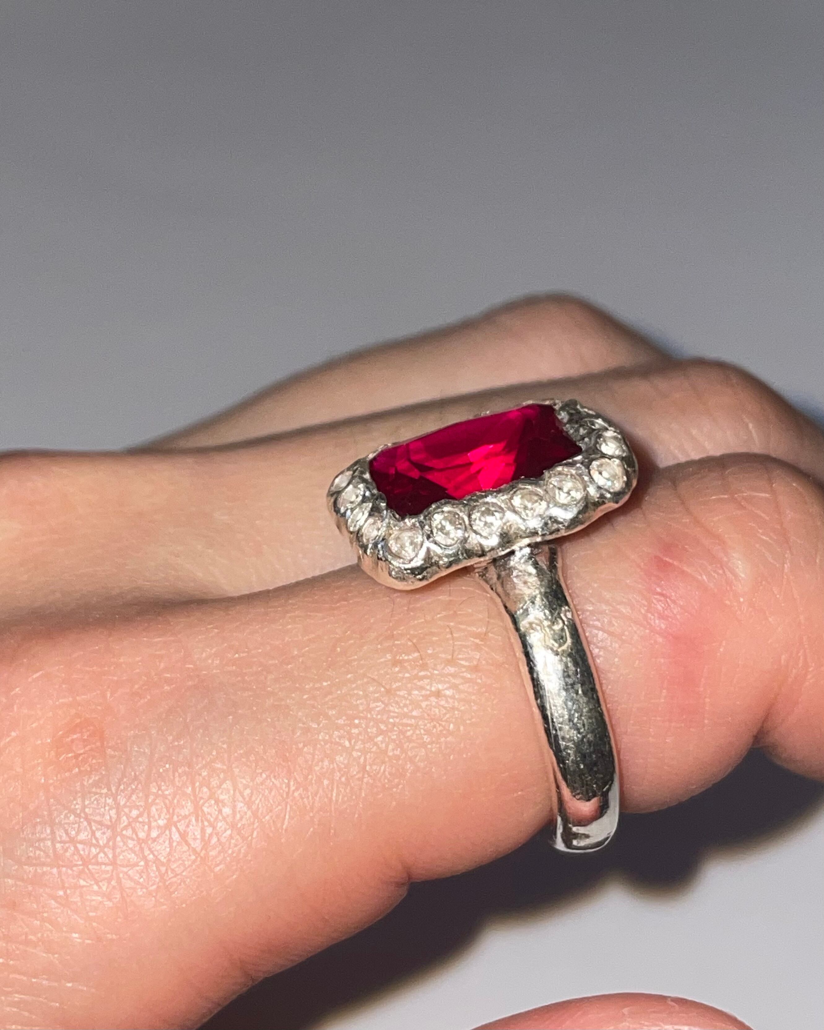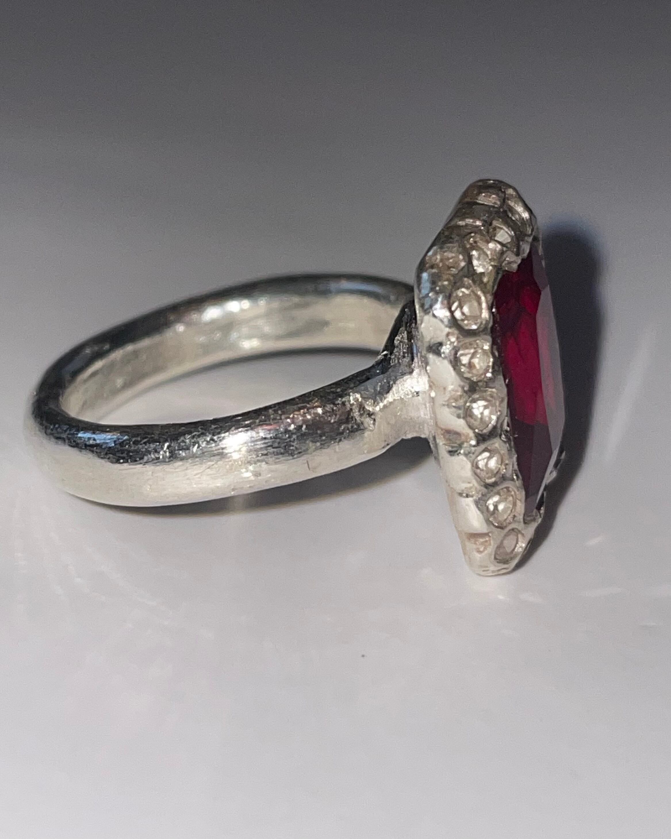 A silver ring made by embedding Synthetic stones in recycled silver clay with a purity of 99.9% or higher.