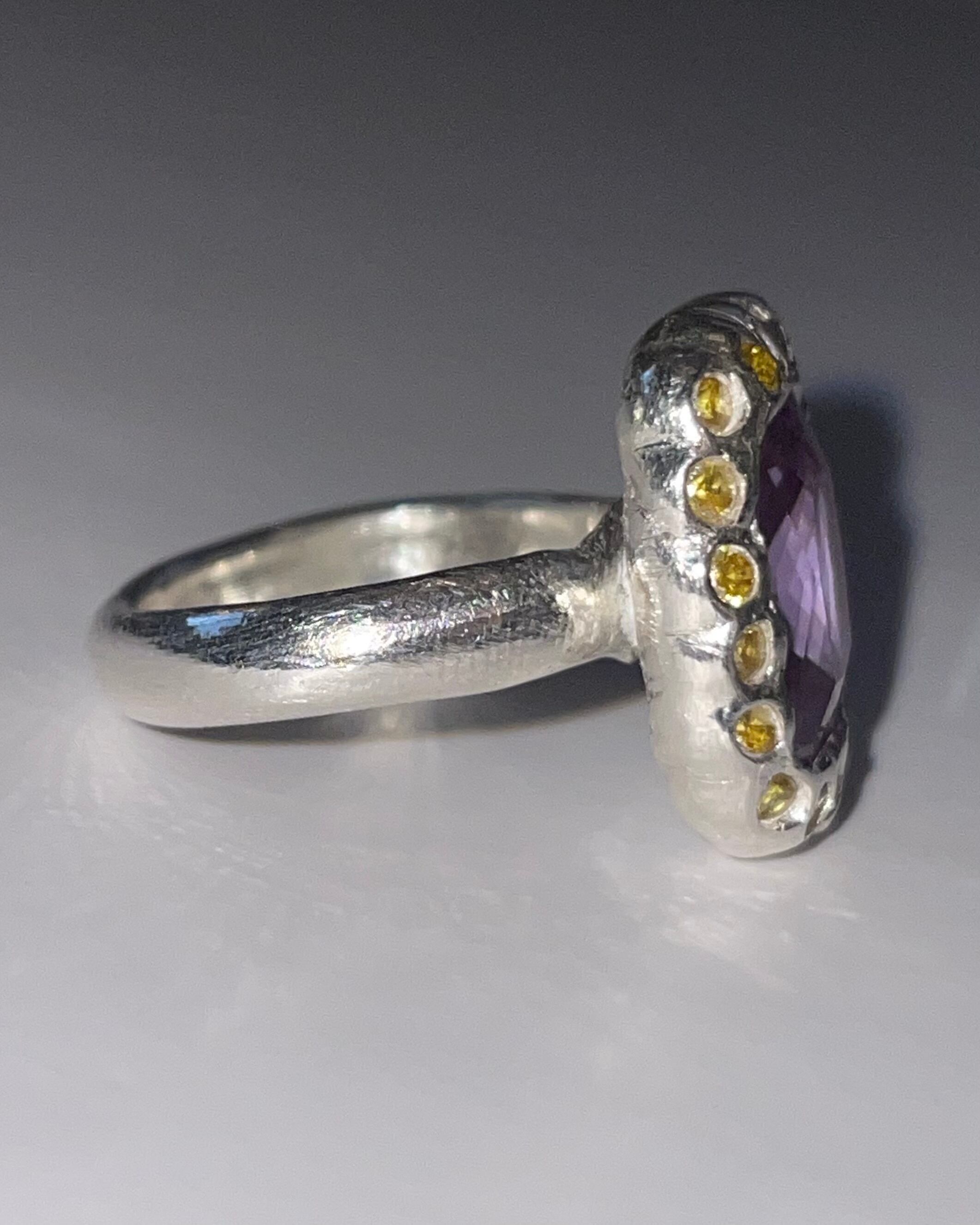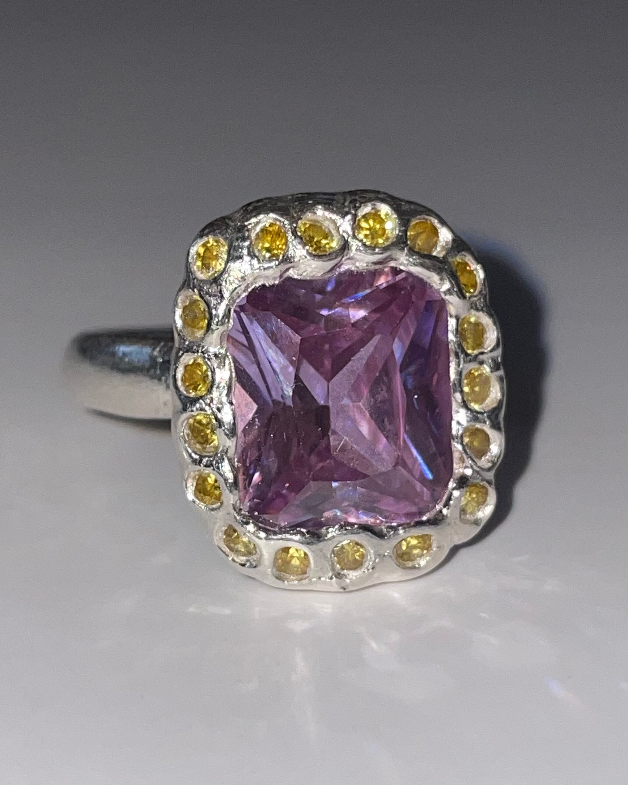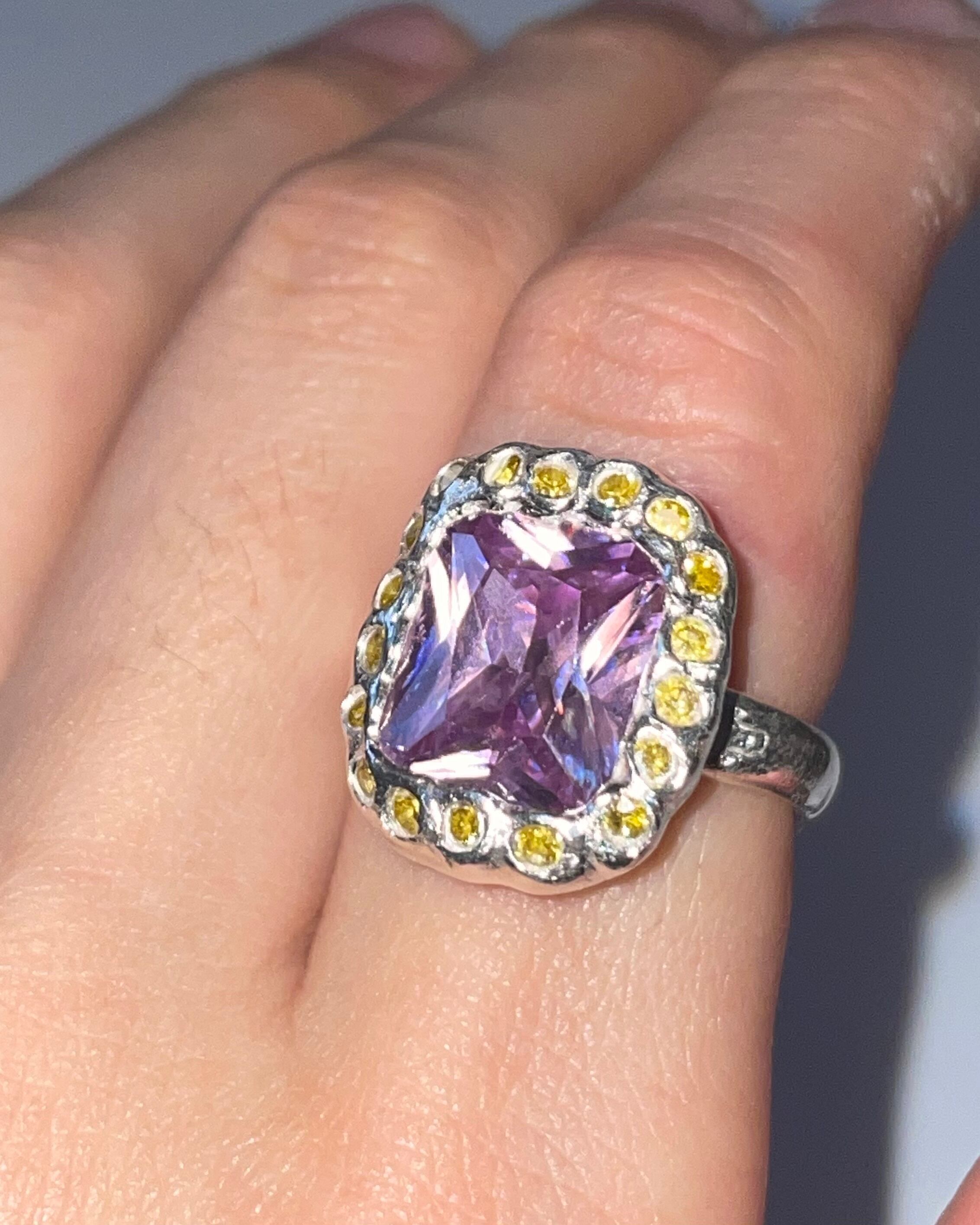 A silver ring made by embedding Synthetic stones in recycled silver clay with a purity of 99.9% or higher.