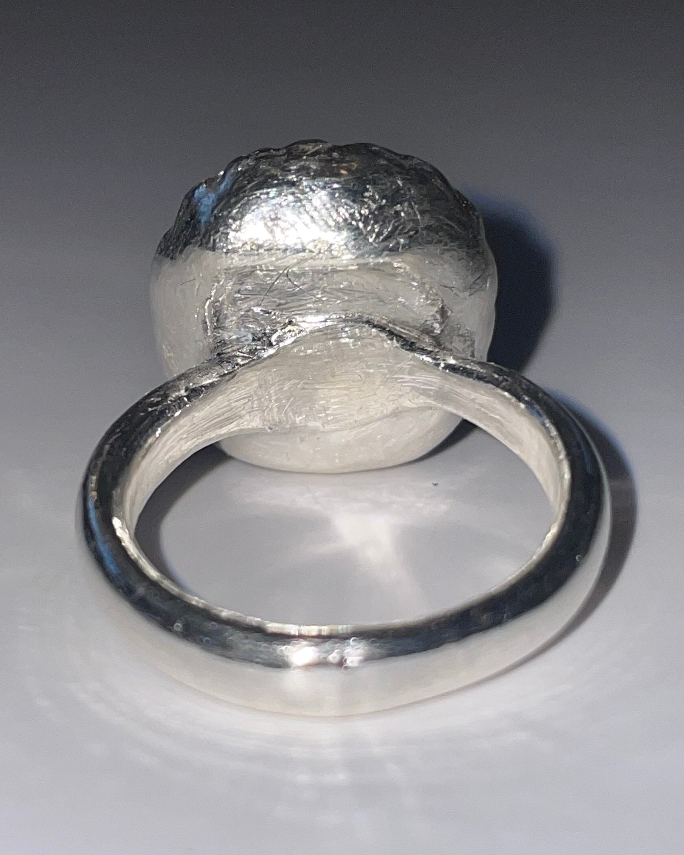 純度99.9%以上のリサイクル銀粘土に合成石埋め込んで焼き上げたシルバーリングです。