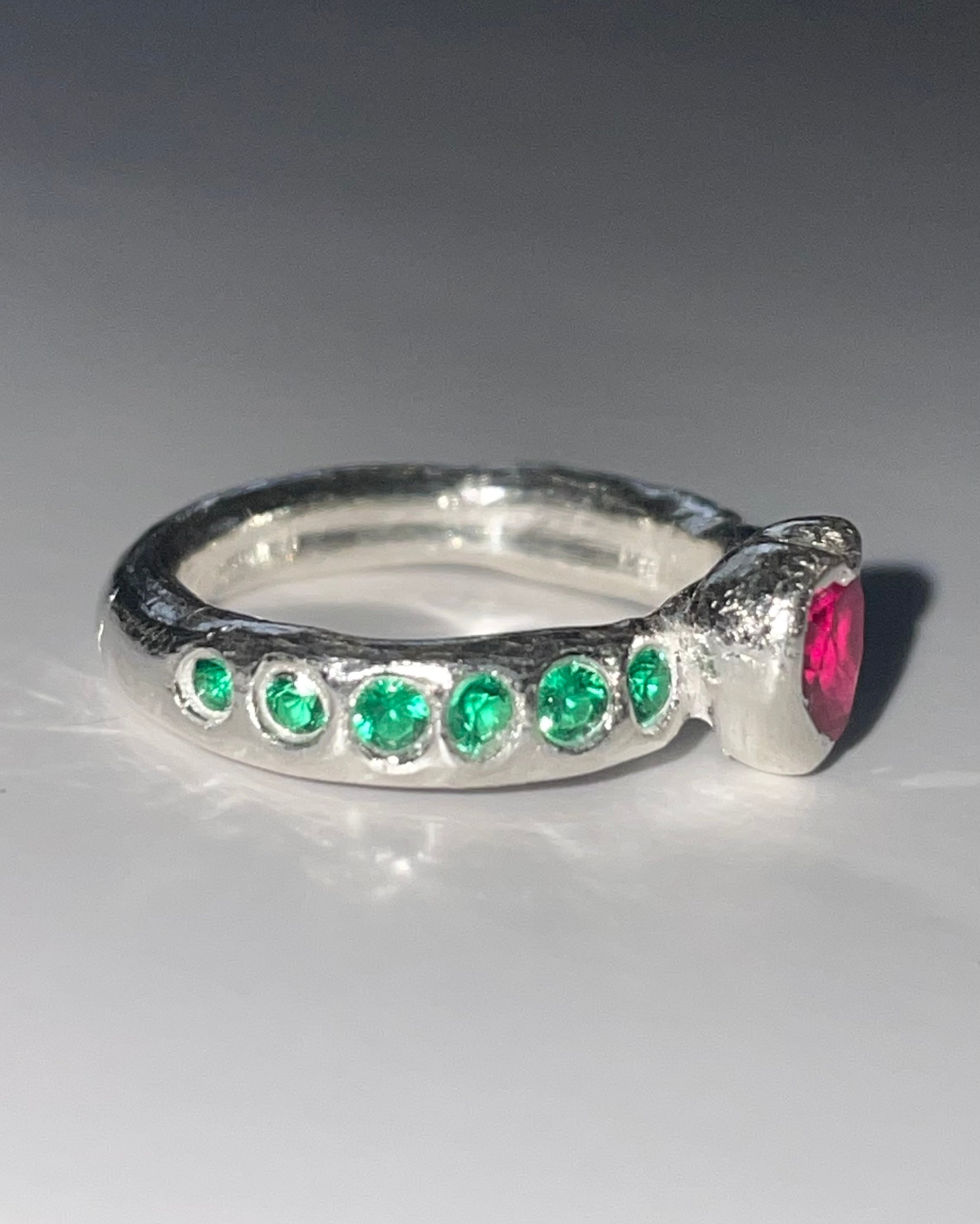 A silver ring made by embedding Synthetic stones in recycled silver clay with a purity of 99.9% or higher.