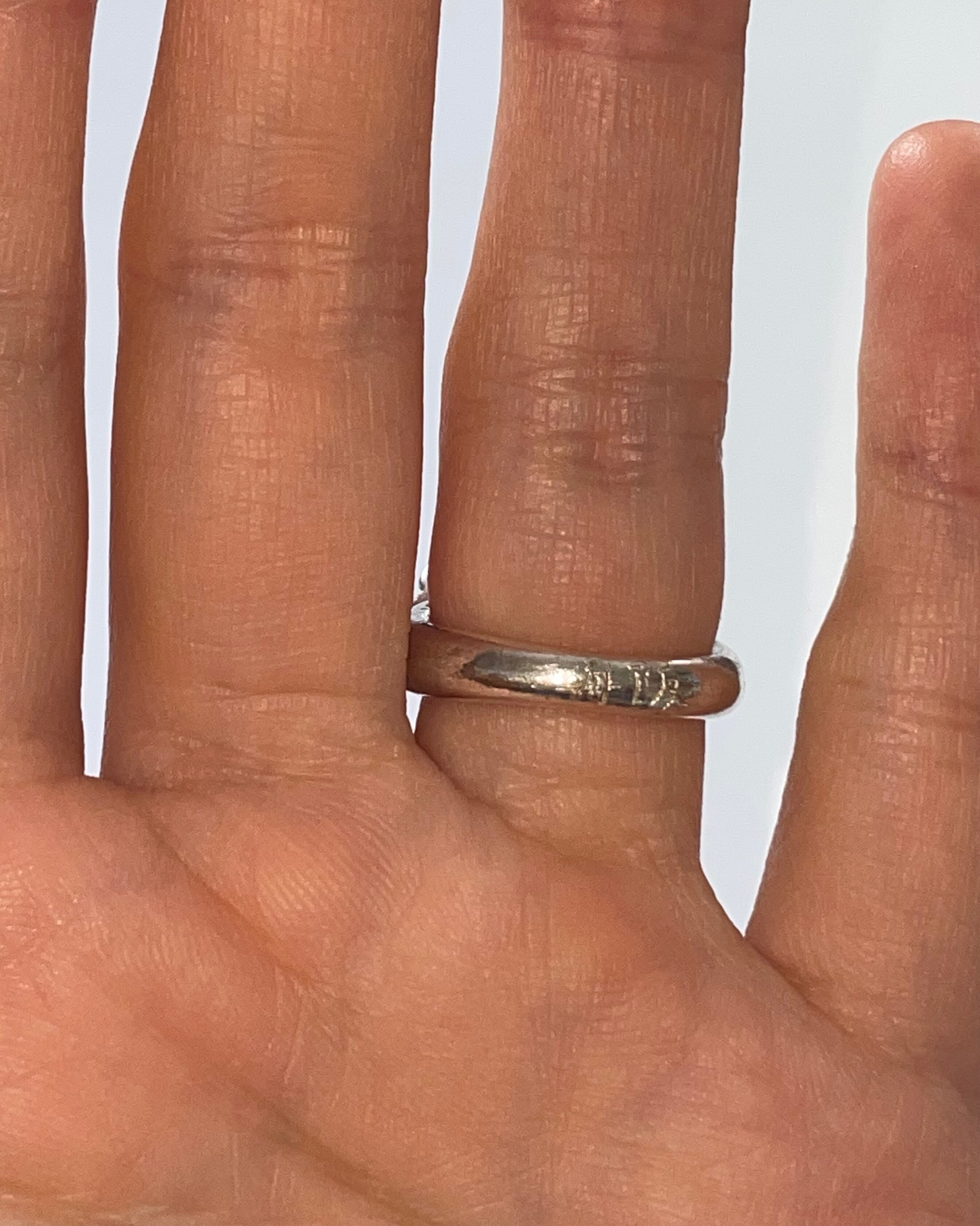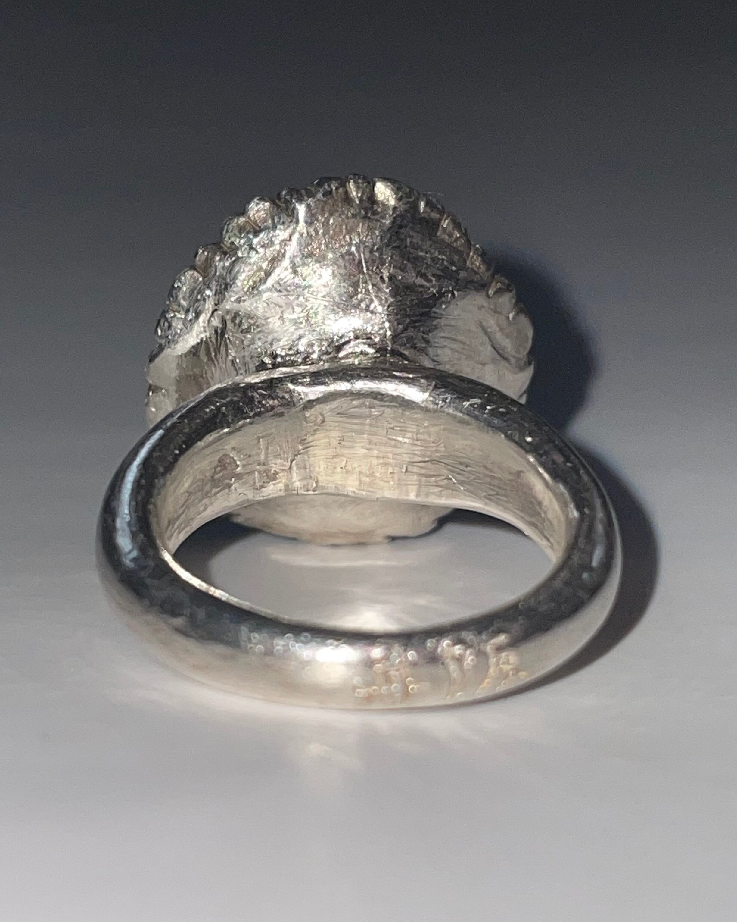 純度99.9%以上のリサイクル銀粘土に合成石埋め込んで焼き上げたシルバーリングです。