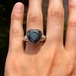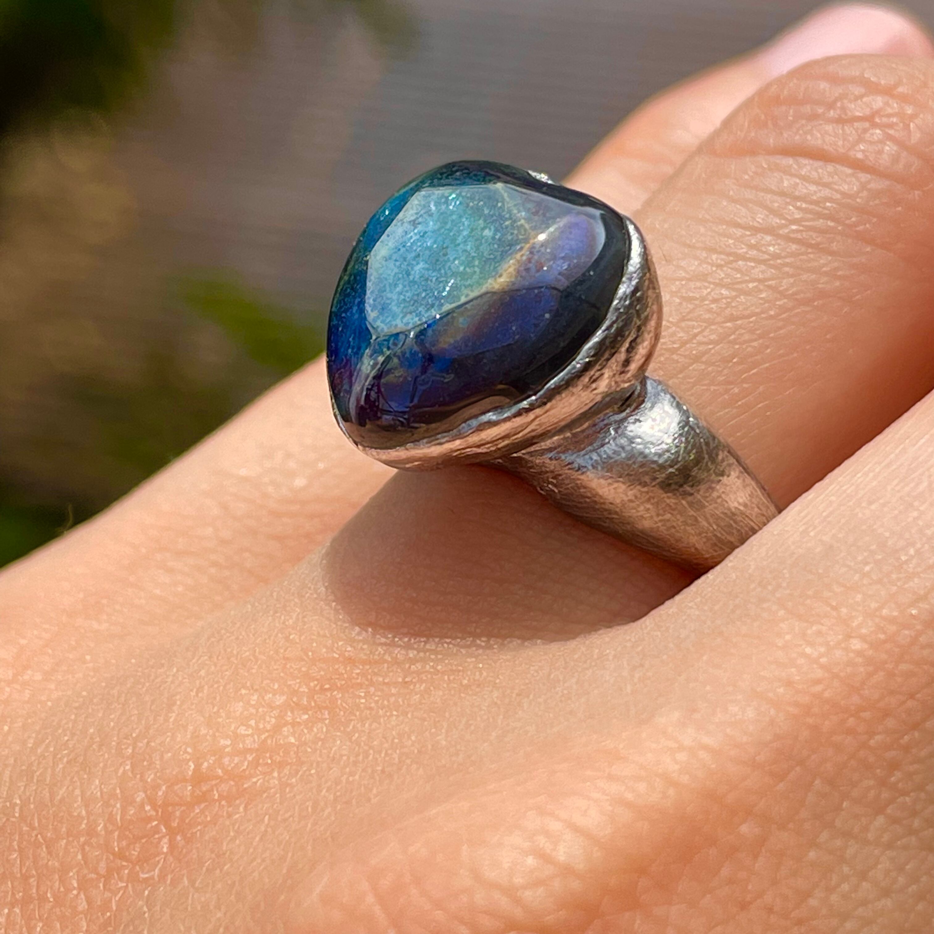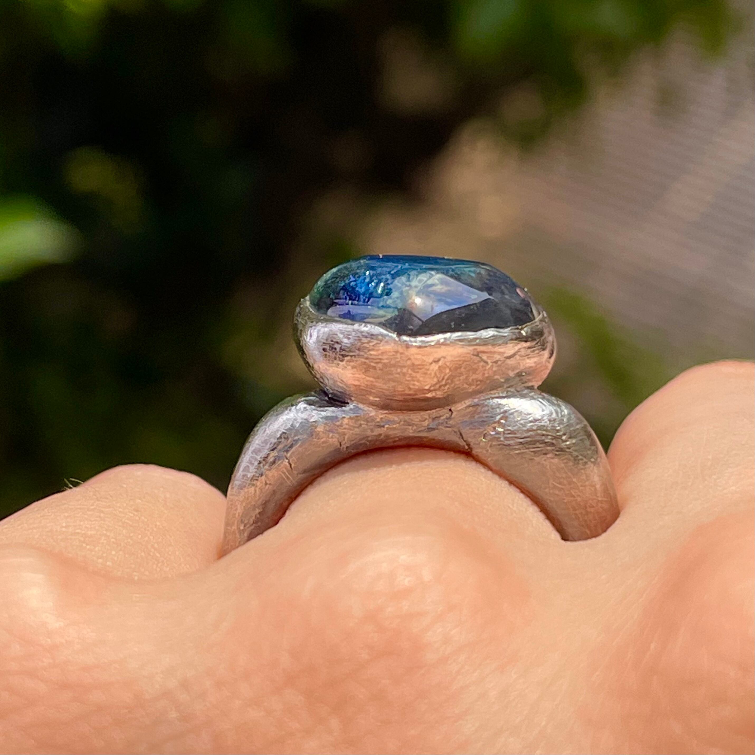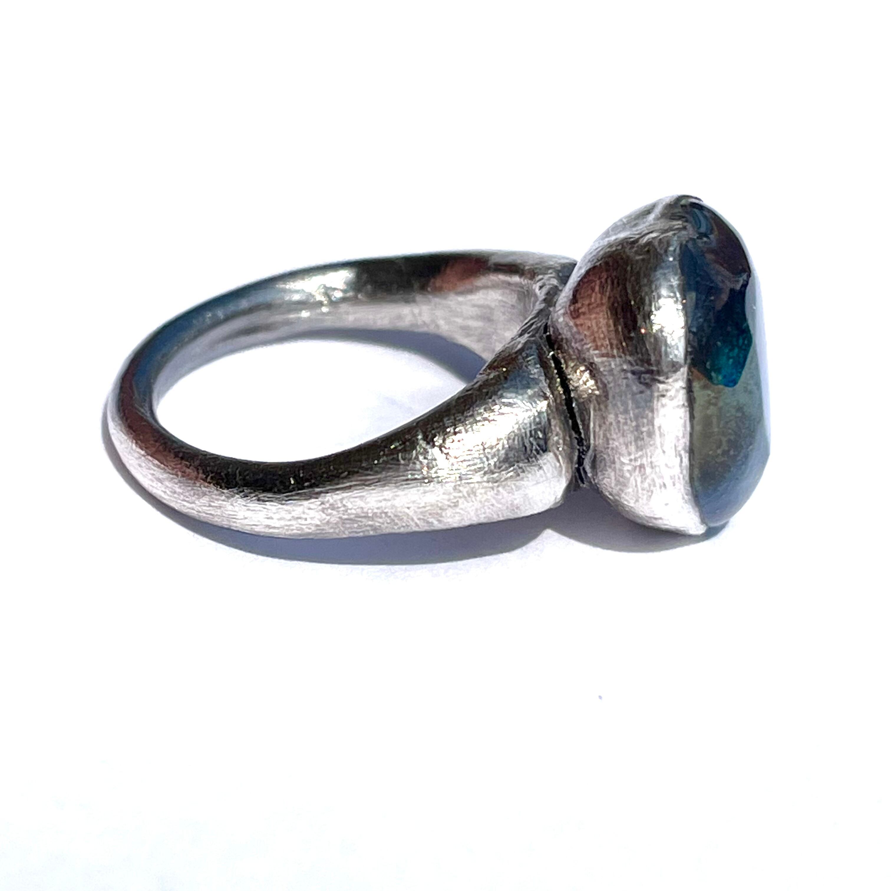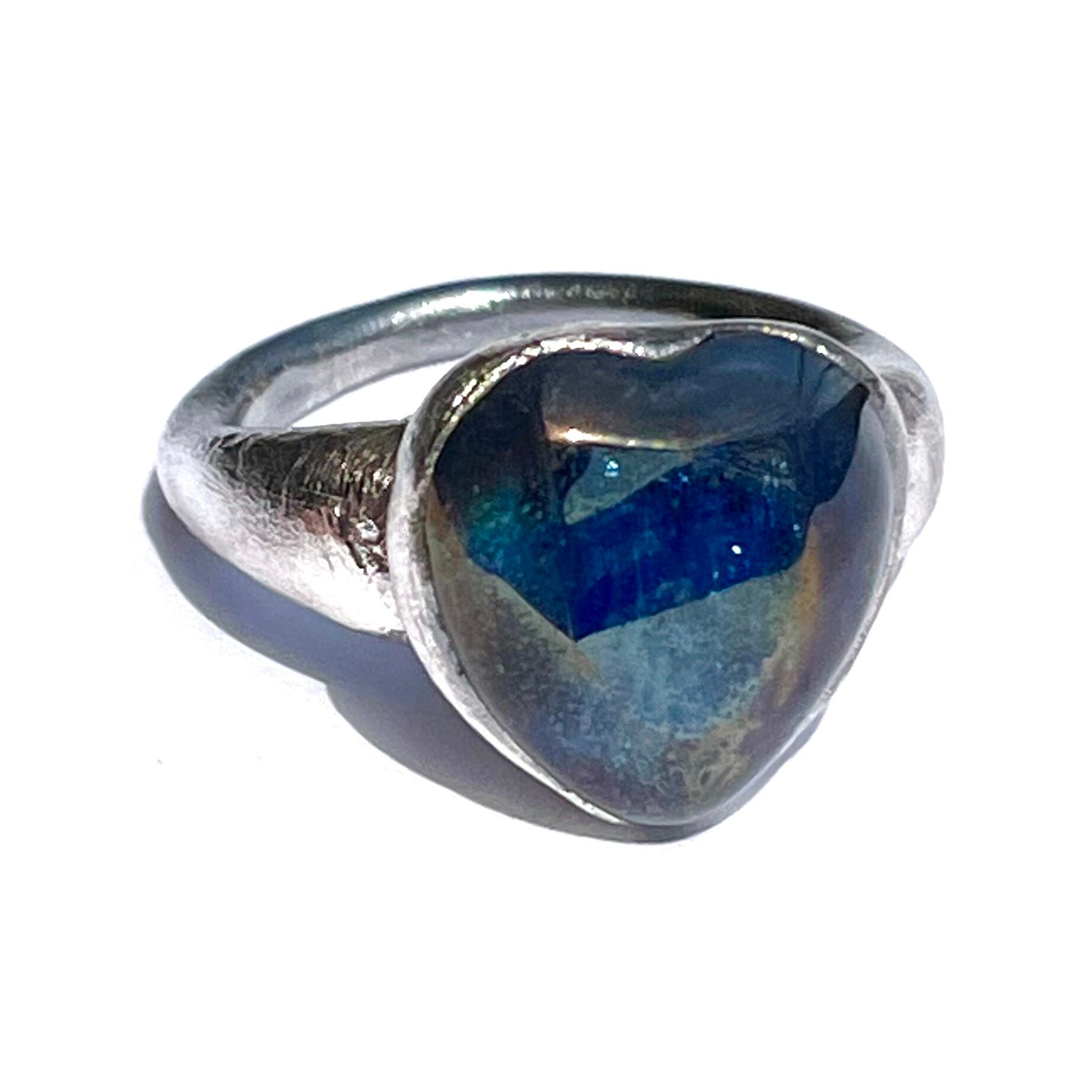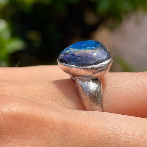 純度99.9%以上の銀粘土を使ったシルバーリングです。ドラゴンブレス(チェコガラス)を埋め込んで焼き上げました。