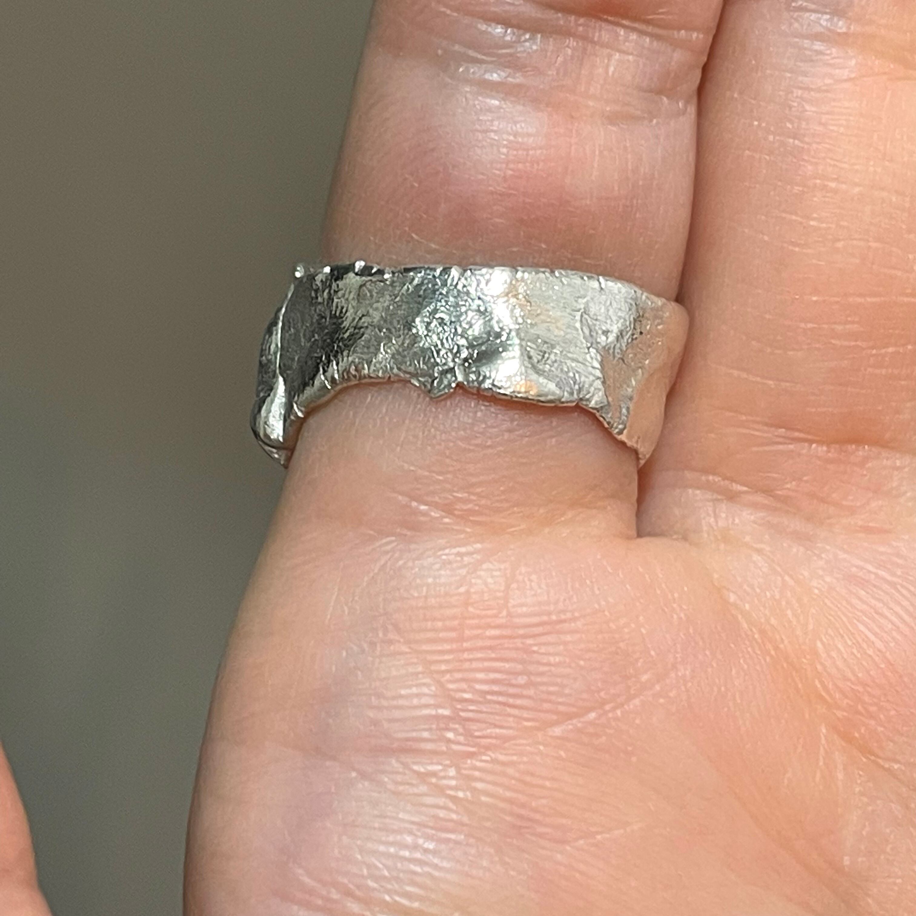 A silver ring made of recycled silver clay with a purity of 99.9% or higher.